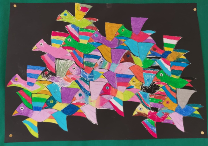 Na de les over Escher zijn de kinderen aan de slag gegaan met het ontwerpen van hun eigen vogel. Zodra de vogel af was, hebben we het opgeplakt op een groot, zwart papier (dan komen de kleuren mooi uit). De vogels passen precies in elkaar, waardoor er een groepswerk bestaat.