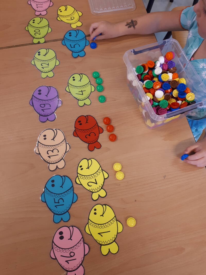 Het liedje: 10 kleine visjes, kun je gemakkelijk gebruiken om het tellen van 10 tot 0 te oefenen. Het is fijn voor de kinderen, vooral de kleuters uit groep 1, om er een beeld bij te hebben. Hieronder zie je een foto van gekleurde en gelamineerde visjes met getallen erop. Ook tot 20. De reden daarvan is dat de visjes na het leren zingen van het lied toegevoegd kunnen worden in de rekenhoek. Ook de kleuters ui groep 2 hebben dan meer uitdaging.