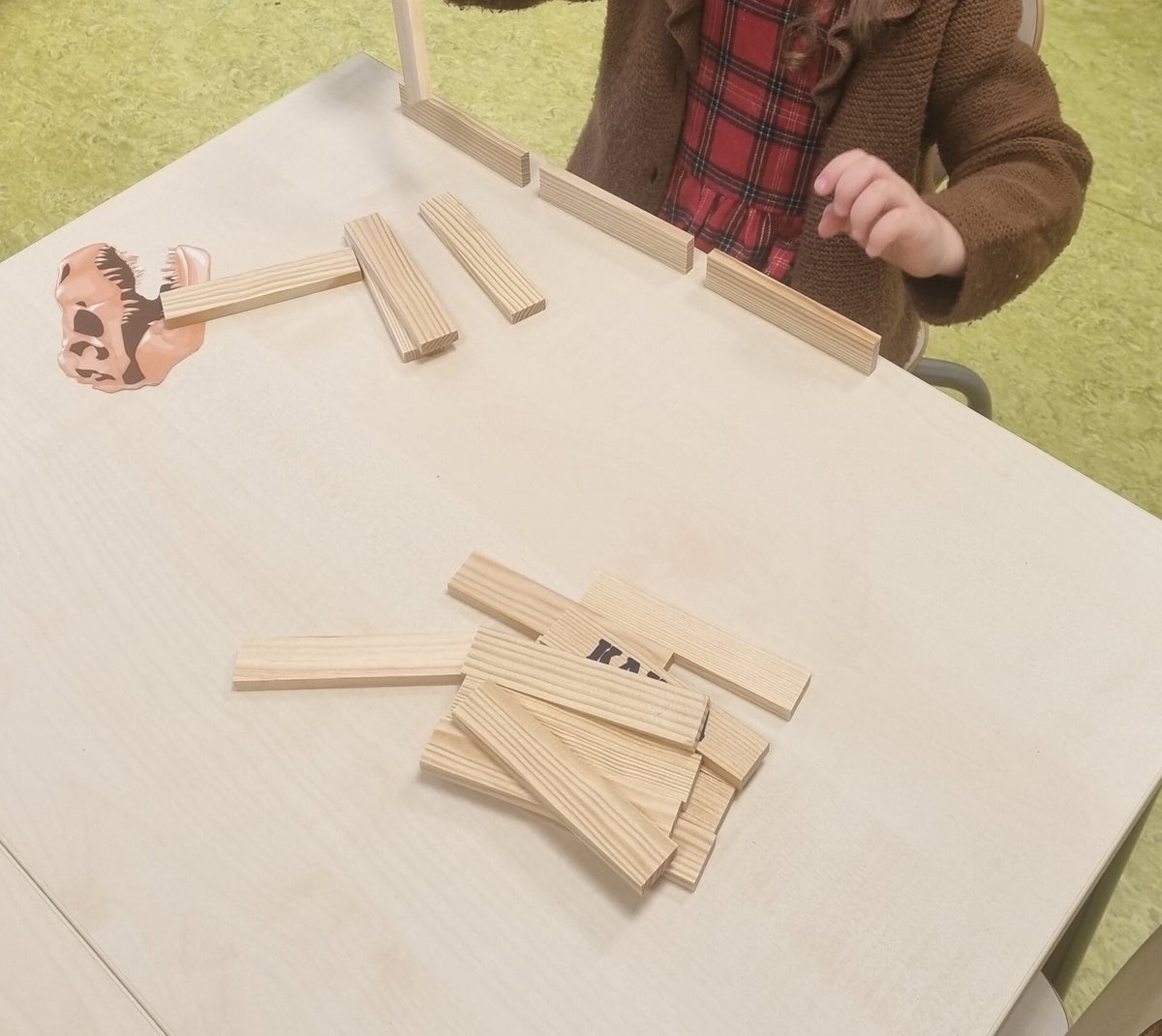 De kinderen bouwen een dino van Kapla. Het enige aanvullende dat nodig is, is een