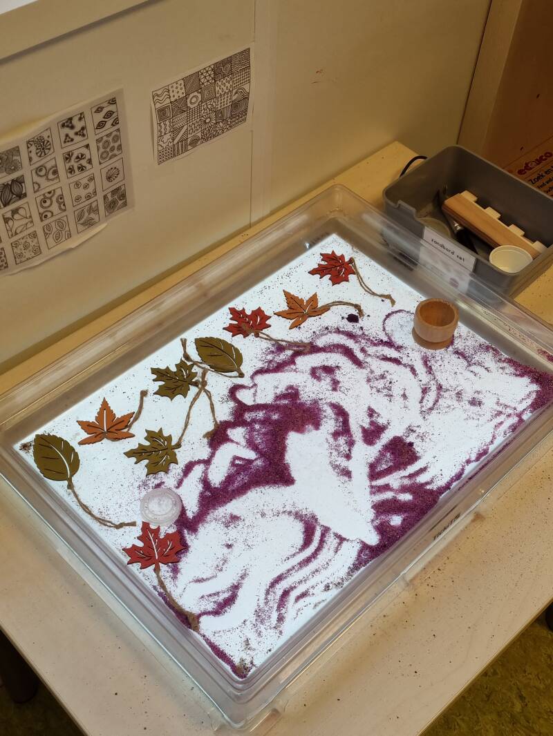 Op de lichttafel ligt gekleurd, zeer fijn zand om in te kunnen tekenen. Daarnaast liggen er verschillende soorten en kleuren blaadjes, materialen om lijnen te maken in het zand en voorbeelden aan de muur om na te maken.