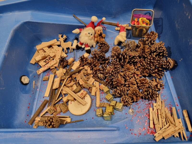 Een speelbak gericht op het ontwikkelen en prikkelen van de sensomotoriek. Gevuld met rijst, een kerstman, slingers, dennenappels, knijpers en kapla.