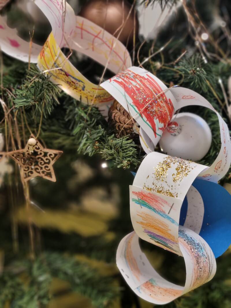 in de boom hangen. Alle kinderen versieren een strookjes papier. Als het klaar is, plak