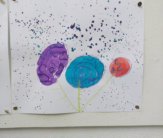 met een kwast en druk je af op papier. Zo ontstaat er ook allerlei bloemvormen.