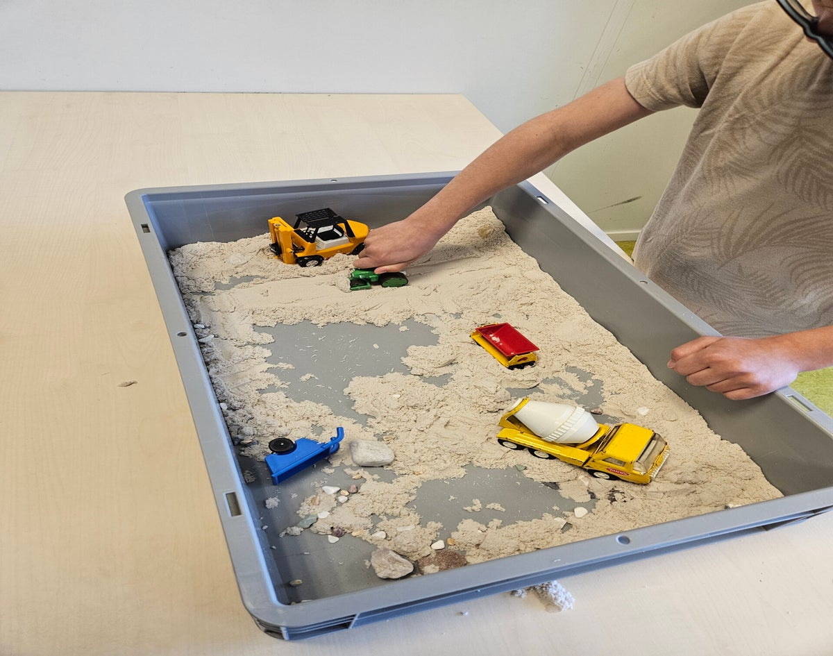 De zandtafel kan je binnen het thema stenen erg leuk inrichten. Wij hebben ervoor gekozen om kinetisch zand te gebruiken. Hier kunnen zelf ook stenen van gemaakt worden, omdat dit blijft plakken. Daarnaast hebben we het volgende toegevoegd: