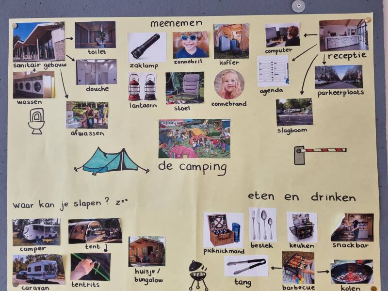 De kinderen tekenen zichzelf (met evt. familie/vriendjes) op de camping. Ze tekenen met krijt en vullen de